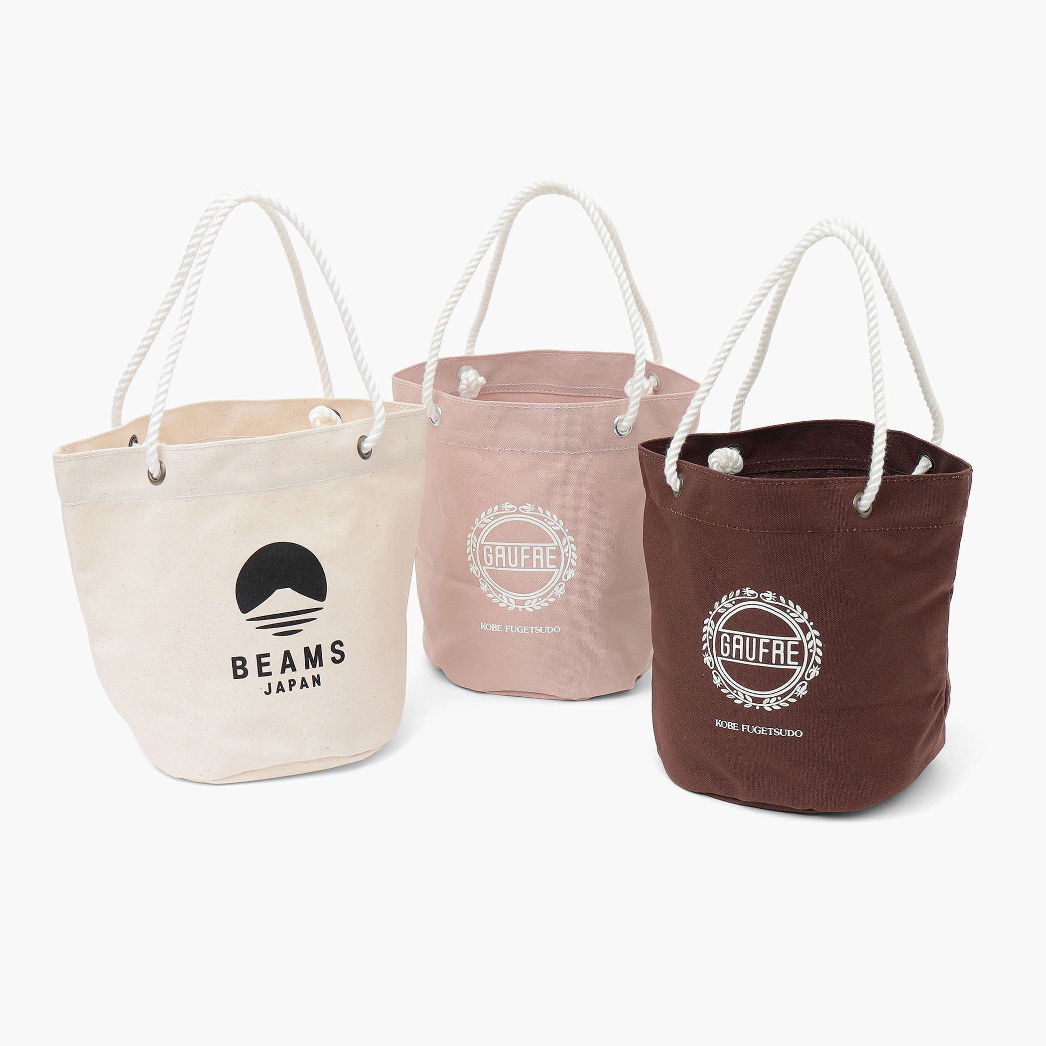 神戸を代表するお菓子〈神戸風月堂(コウベフウゲツドウ)〉の「ゴーフル」の丸缶がすっぽり入るキャンバス製のバケツ型トートバッグは「ビームス ジャパン 神戸」の限定商品で、同じく神戸の登山用品専門店〈神戸ザック(コウベザック)〉が製作するトリプルコラボアイテムです。