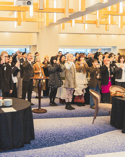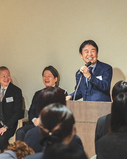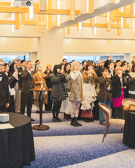 式典後には懇親会が開催され、新入社員が配属先ごとに分かれて自己紹介をする場面も。ユニークなパフォーマンスと共に挨拶するグループもあり、会場はビームスらしい和やかなムードに。
