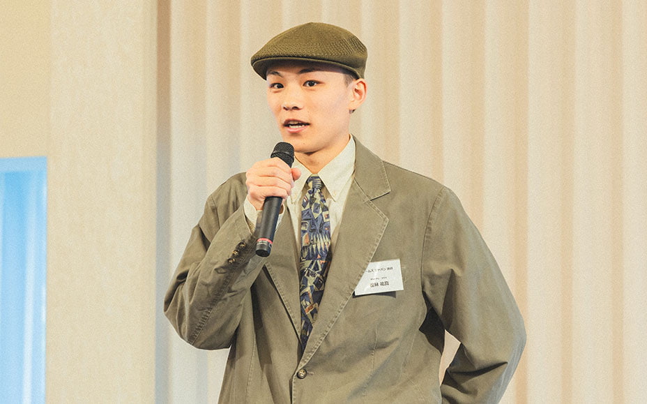 懇親会で今後の意気込みを語る松林さん。