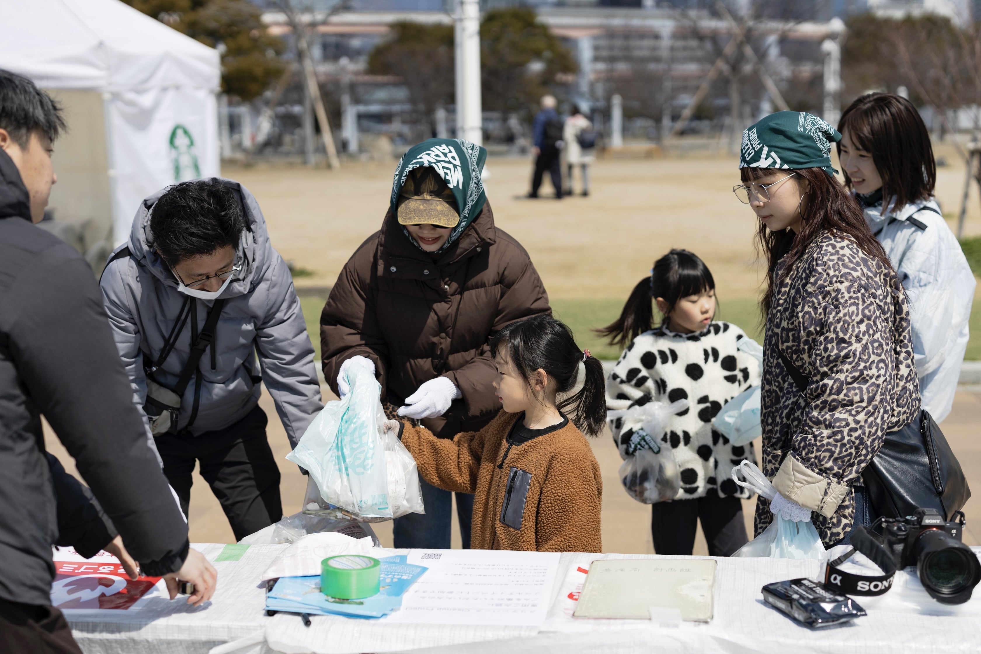 A.趣旨を理解し、意思をもって取り組んでもらえる参加者を増やしたかったので、2回目のイベントからは指定のゴミ袋を配布する形をとりました。ごみ拾いスタート前にJR駅周辺の参加企業各店舗で受け取ってもらえれば、そこからメリケンパークまでのルートは自由。また、参加したお子さんを対象にノベルティのバンダナの“シルクスクリーンライブプリント体験”を実施したのですが、体験目当ての方が増えて本末転倒にならないよう、あえて「事前告知をしない」という選択をとることにしました。