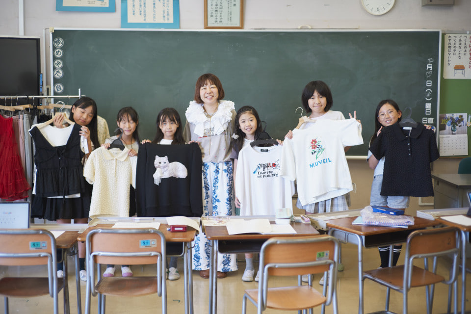ビームスの本分であるファッションについて、未来を担う子どものたち向けに特別授業をおこなうというものでした。講師を担当することになったのは、〈BEAMS COUTURE(ビームス クチュール)〉デザイナーの水上路美さん。オリジナル商品のデッドストックをベースにしたアップサイクルで商品を生み出すという、ビームスの中でもサステナブルなものづくりをしている人物です。授業に参加する千駄谷小学校の児童は、3年生から6年生、計6名。デザイナー志望の子から、スタイリングを学びたいという子、ヘアメイク好きまで、広くファッションに興味のある精鋭たちが集まりました。通常の授業が終了した昼さがり、約1時間の特別講座のスタートです。