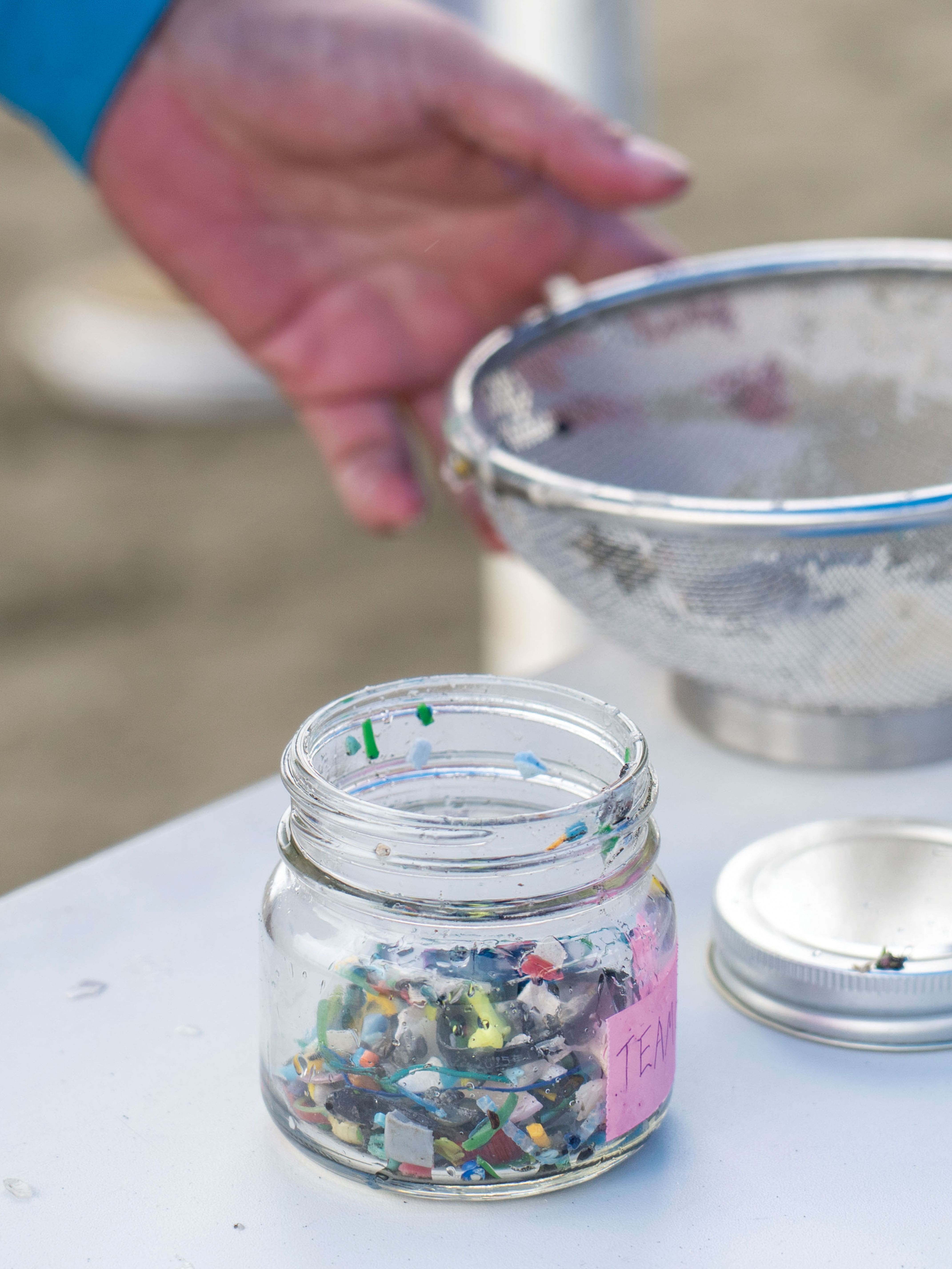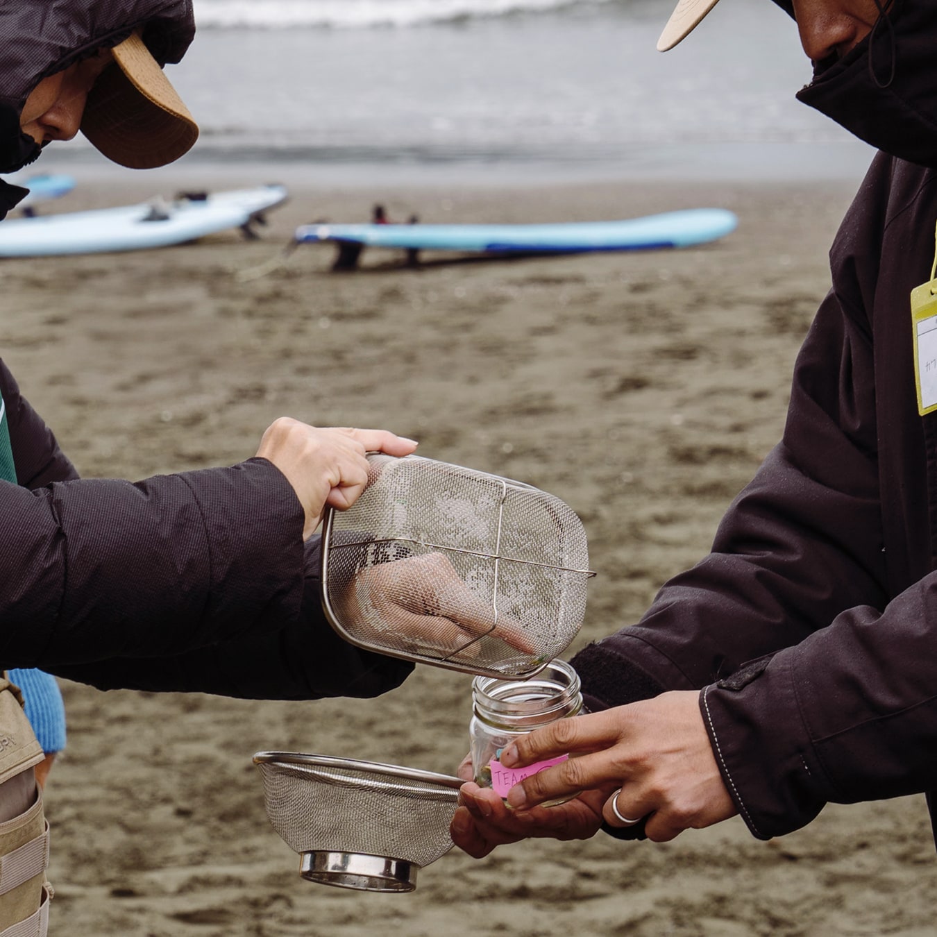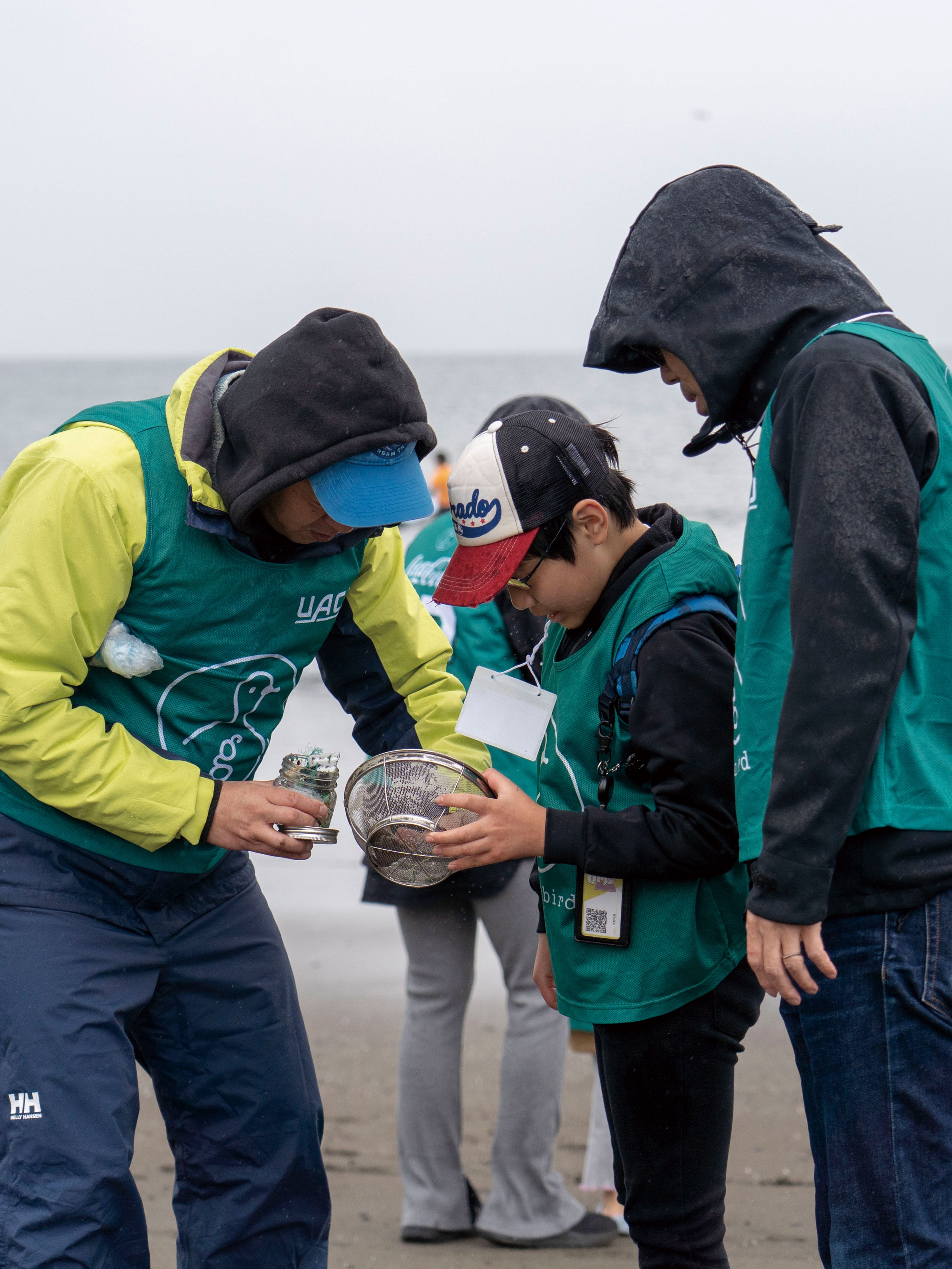 ザルを使えばプラスチックの破片を探すのも意外と簡単。当日は雨で砂浜が湿っていたため、急遽ビニルプールを用意してザルで取った砂を落としながら、小さなプラスチック片を収集しました。マイクロ可する前のプラスチックを拾うのも大事な目的の一つ。集めたプラスチックはビンに詰めて、どれくらい取れたのかみんなでチェックします。