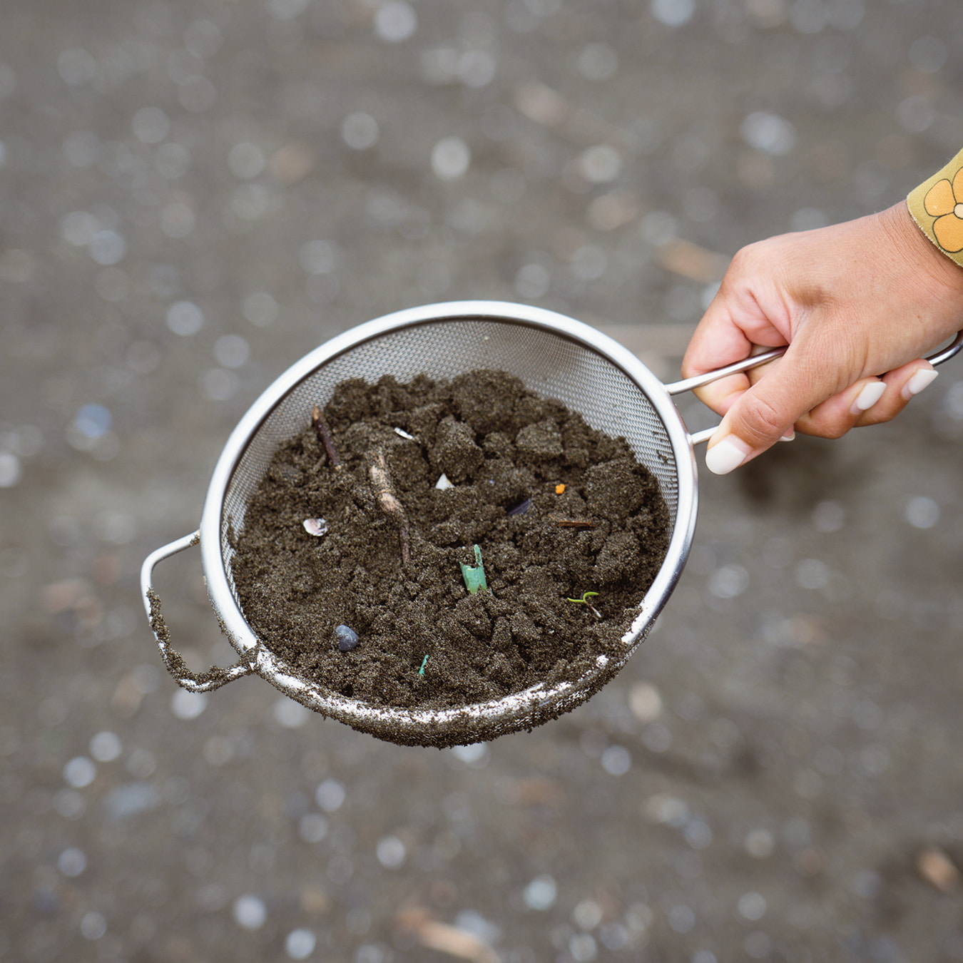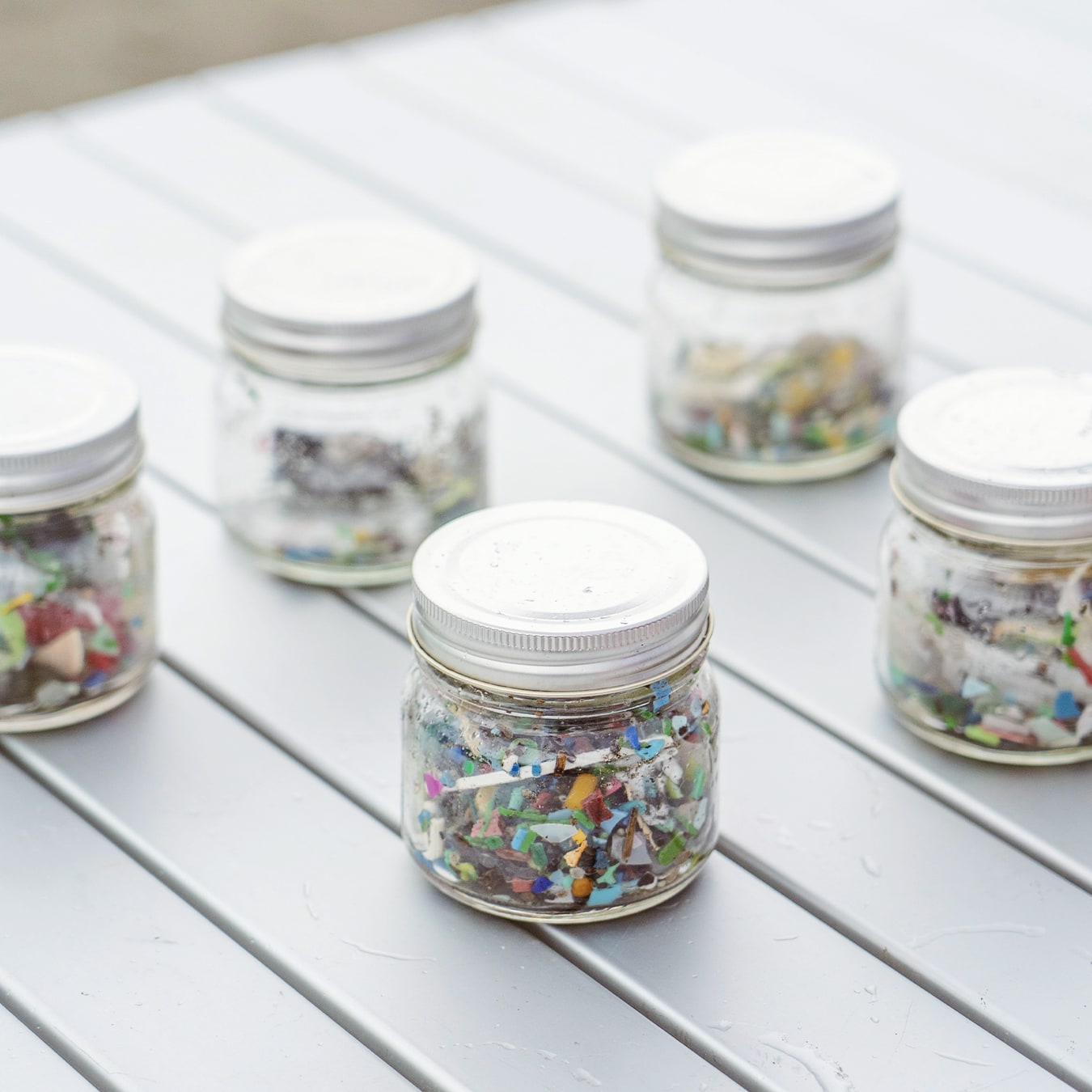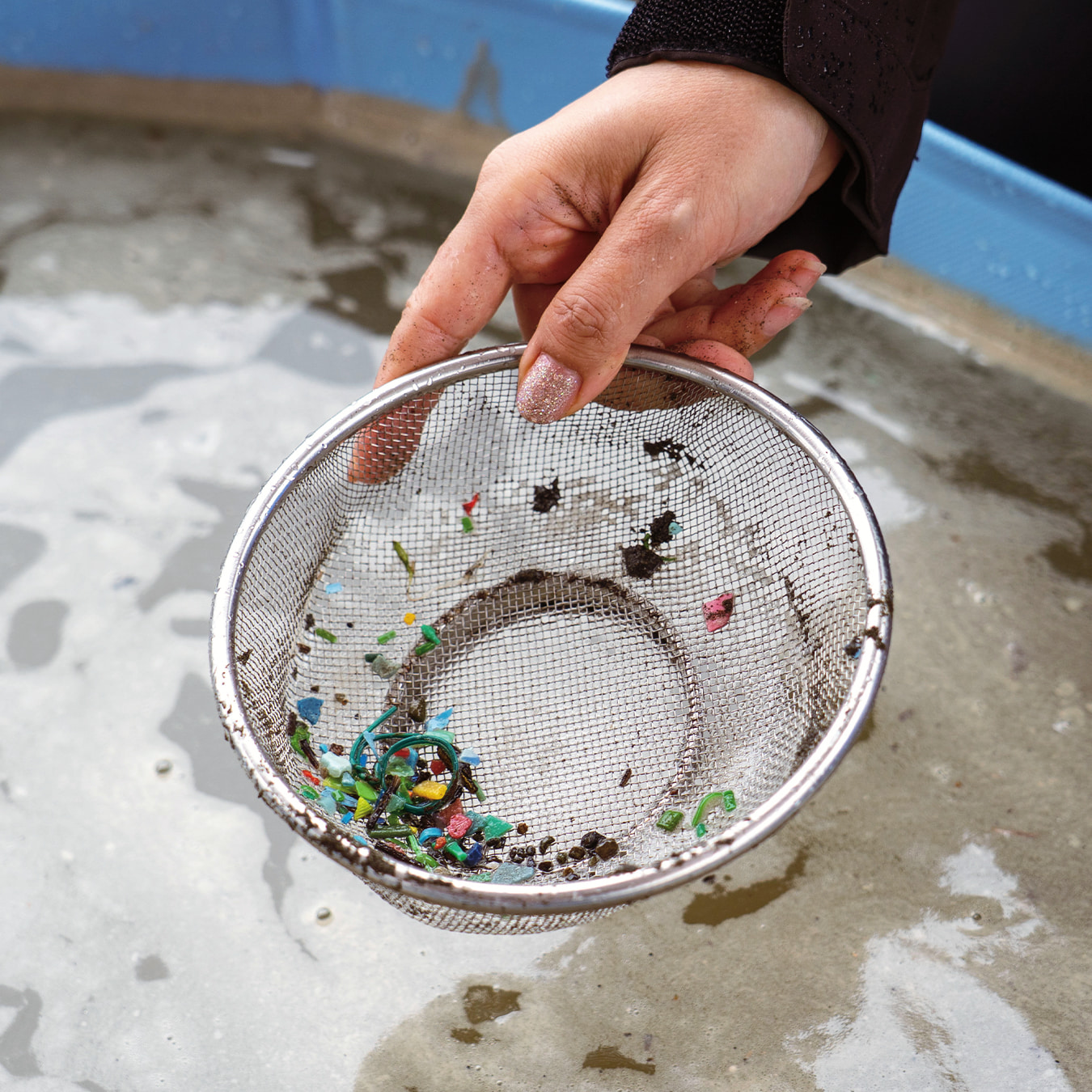 ザルを使えばプラスチックの破片を探すのも意外と簡単。当日は雨で砂浜が湿っていたため、急遽ビニルプールを用意してザルで取った砂を落としながら、小さなプラスチック片を収集しました。マイクロ可する前のプラスチックを拾うのも大事な目的の一つ。集めたプラスチックはビンに詰めて、どれくらい取れたのかみんなでチェックします。