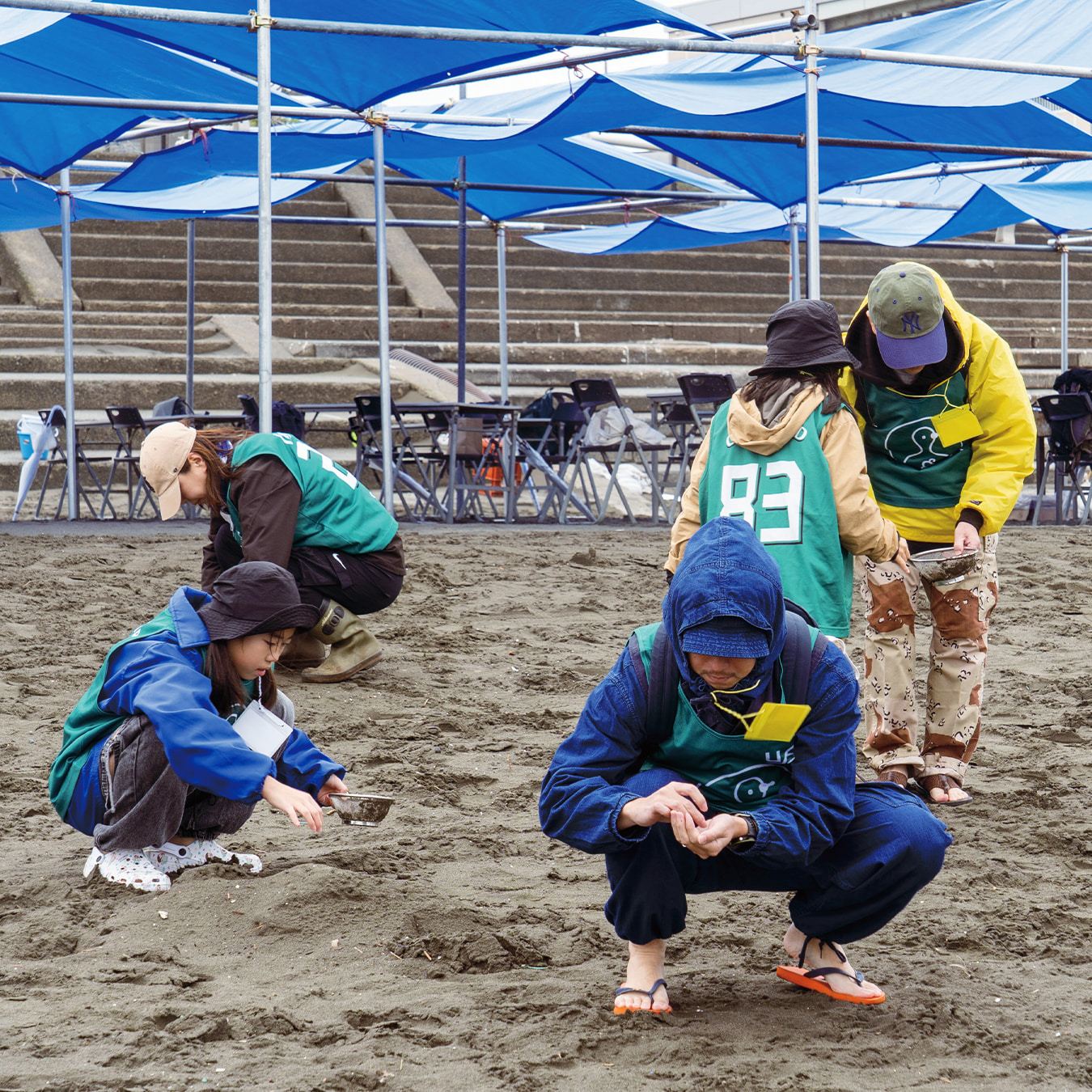 一見きれいに見える海岸でも、砂の下には多くのプラスチックやポイ捨てされたタバコなどのゴミがあることを知り、驚く参加者たち。
