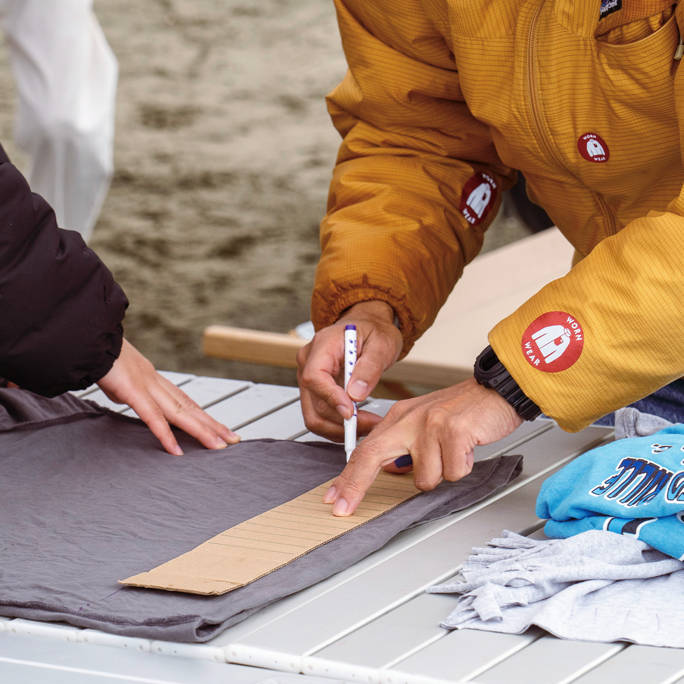 「サステナブルな活動とビームスらしいファッション要素を組み合わせたい」という草野の想いから、以前ビームスの他の店舗で行われた『バッグのリメイクワークショップ』を開催。内容は、参加者が私物のTシャツをその場でバッグにリメイクするというもの。使う道具はペンとハサミのみ。着なくなったTシャツの袖を切り落とし、裾部分に切り込みを入れて結ぶだけ。およそ15分ほどでオリジナルバッグが完成します。「こんな簡単にできるんだね」と、リメイクの手軽さと面白さを感じていただき、夏はTシャツに短パンスタイルが多い湘南の方々に大好評のワークショップでした。