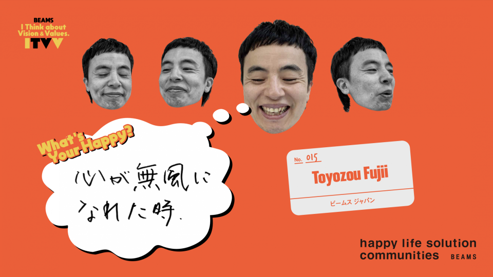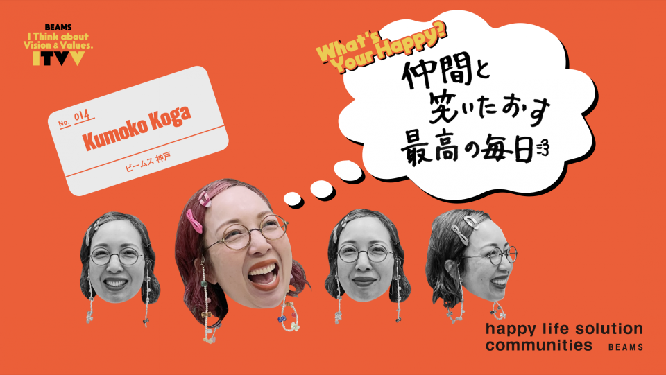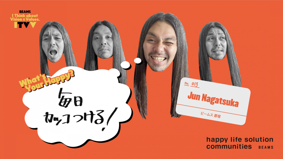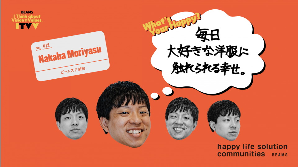 - I THINK ABOUT VISION & VALUES(略して ITVV) は、BEAMSの新しいビジョン「happy life solution communities」とバリューズ(「自分自身がhappyであれ」「happyを提案する」「happyを生み出す」「happyを社会へ、未来へ」)という考え方を、もっともっとたくさんの人に知ってもらいたいという思いから生まれました。BEAMSで働くスタッフが、日々の中でどのようにこのビジョン&バリューズを体現しているのか。ふとした言葉や、何気ない行動の中にある“HAPPYの連鎖”を、言葉や映像でどんどん発信していきます!