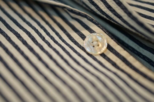 生地の雰囲気に合わせて、シェルボタンを選んでいます。