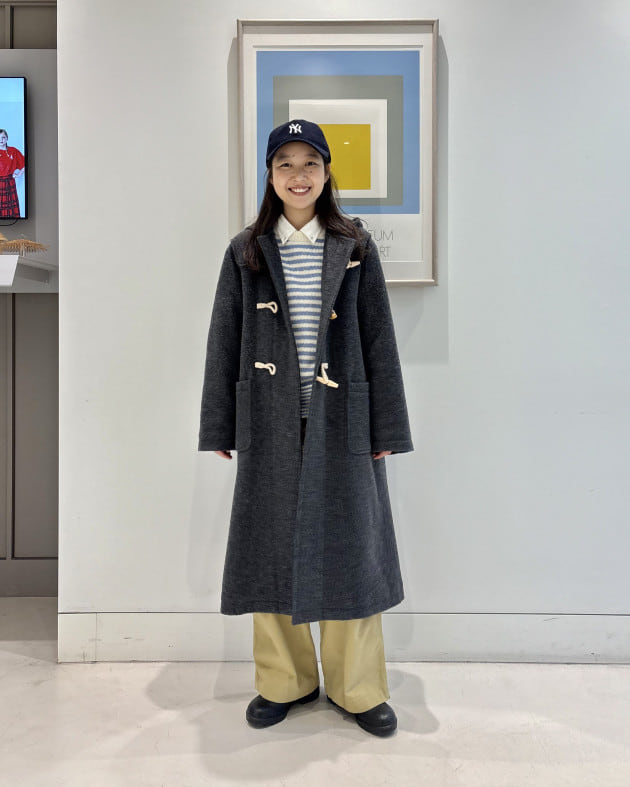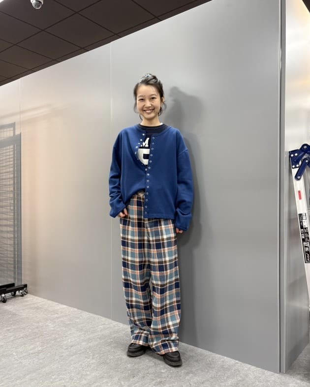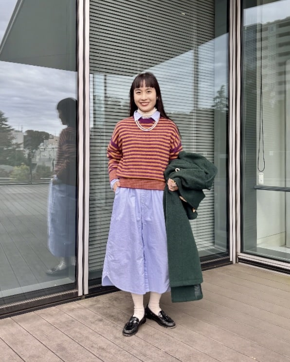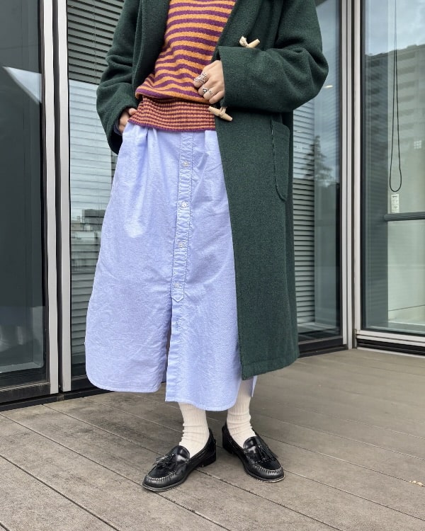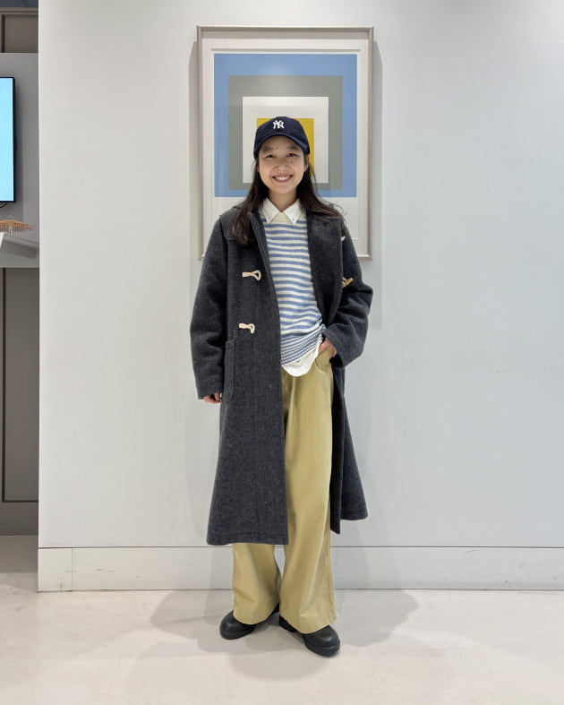 私はシャツと合わせて、全体的にトラッドなアイテムでスタイリング。ネイビーを着用。