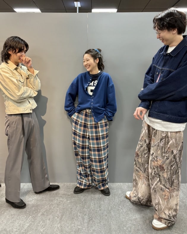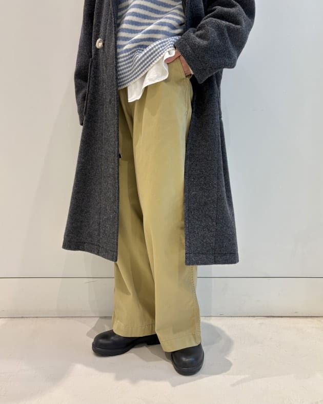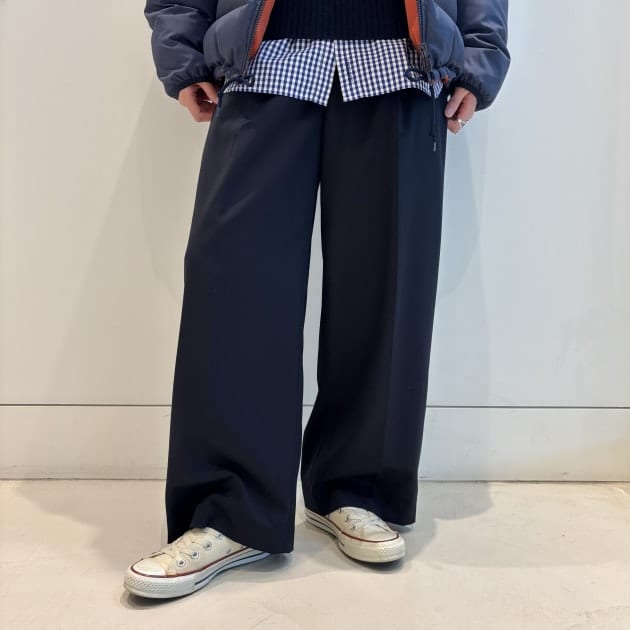 ボトムスは太めのスラックス。