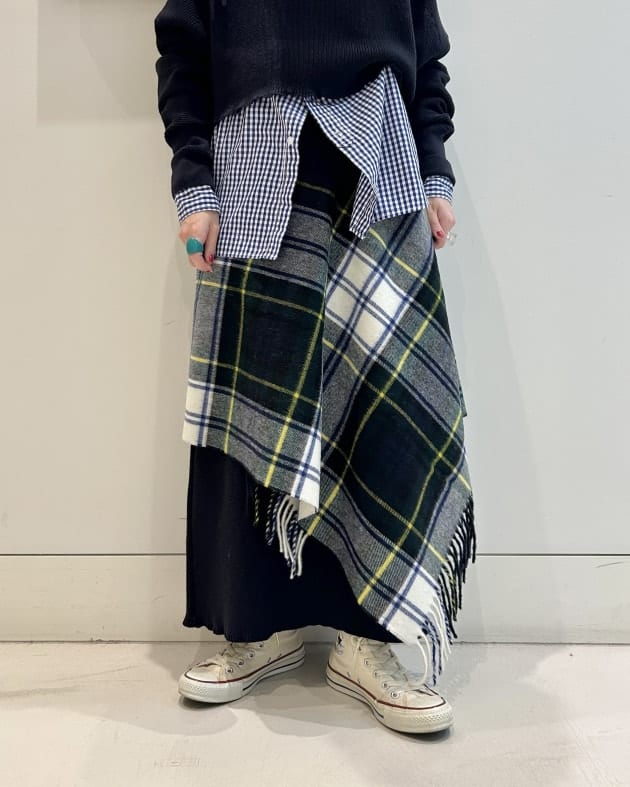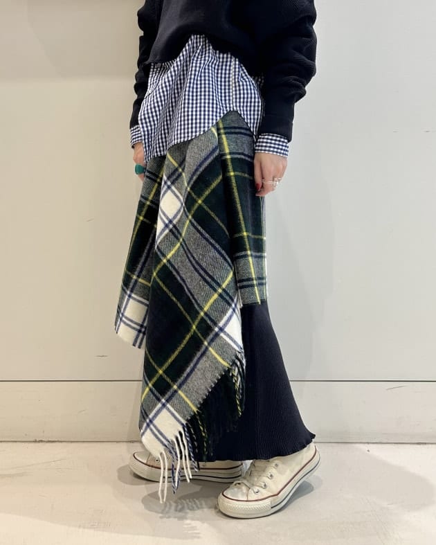 メンズライクなダウンジャケットのボトムスに、女性らしいハリスツイードのチェックのスカートを合わせています♡