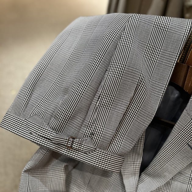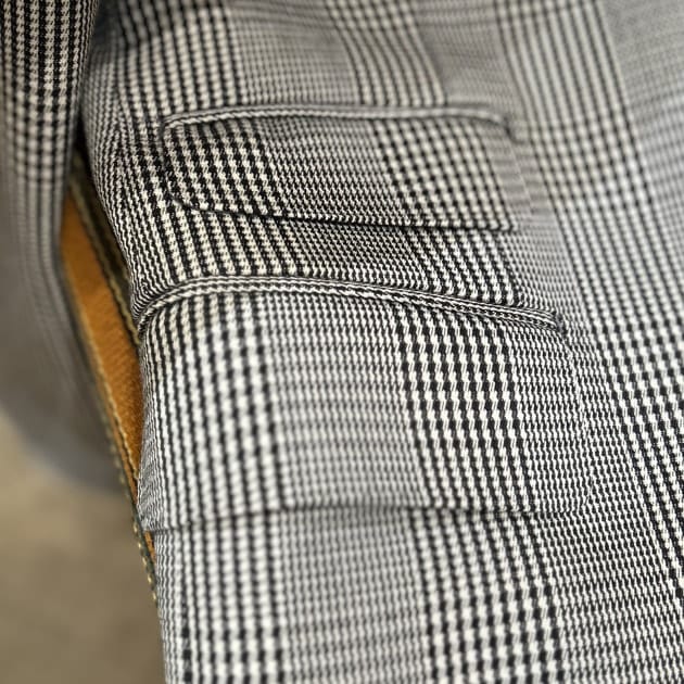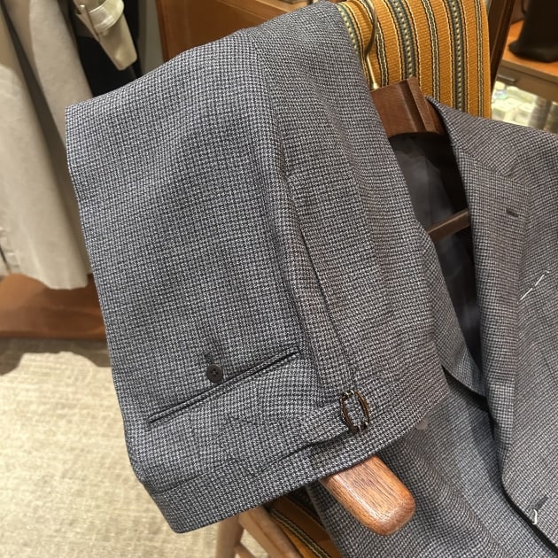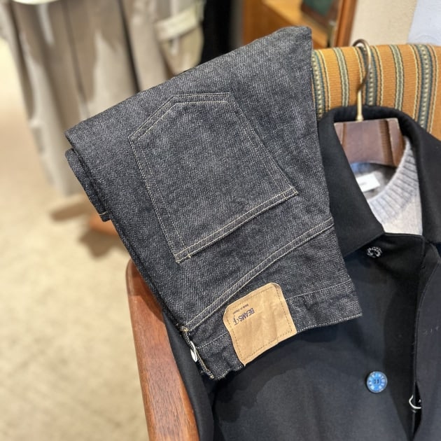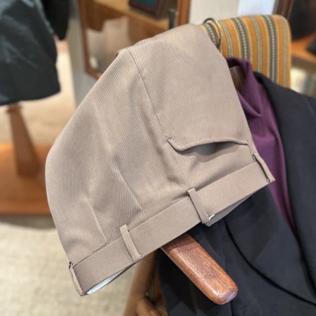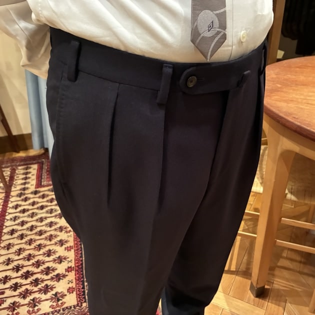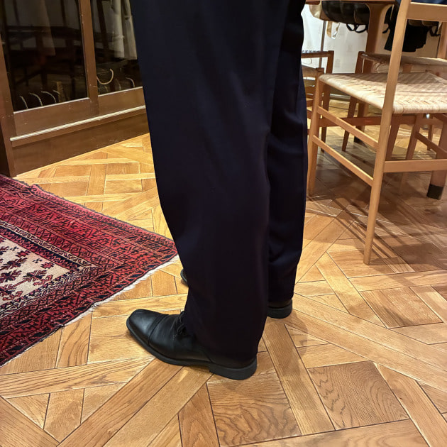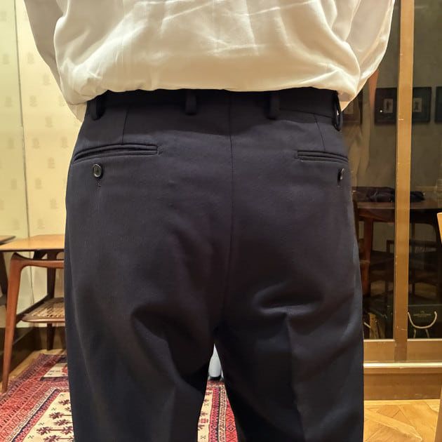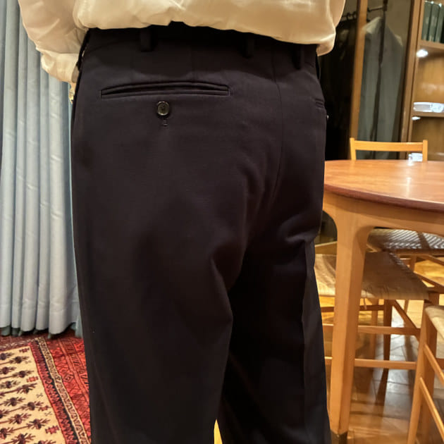 ビスポークの空気感を感じるLポケットのスラックス。ややフレアなシルエットです。