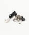 左耳には、ブラックのグローブを模したユニークなパーツから、艶やかな大粒のパールがドロップ。まるでアートピースのようなシュールで大胆な存在感です。右耳には、モノトーンのダイス、ハート、パール、そしてチェーンをこれでもかと詰め込んだチャームフープ。ロックでガーリーな遊び心が満載です。
