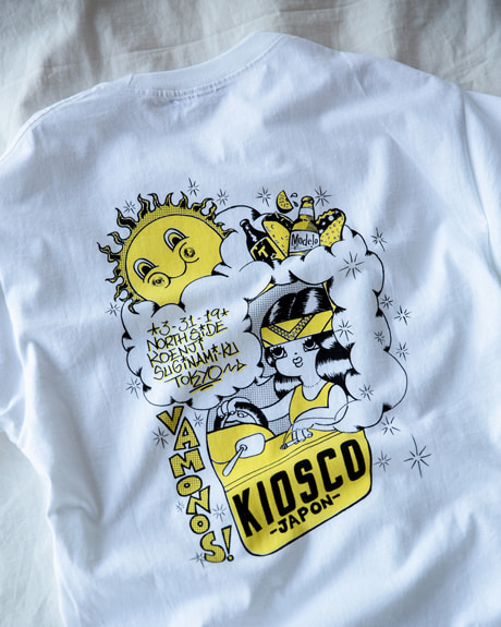 The highlight of this pop-up event will be a variety of limited-edition T-shirts produced by the owner of "KIOSCO" himself, the original brand "RWCHE (Roach)," as well as by "ADOOM," a select shop in Minamiuonuma City, Niigata Prefecture, graffiti writer ZECS, and tattoo artist Yudai Sato, all of whom have close ties to the "KIOSCO" brand. and tattoo artist Yudai Sato, all of whom are closely associated with "". The mix of the iconic logo and graphics drawn by the collaborating artists expresses the comical world of "KIOSCO" in the style of the collaborators.