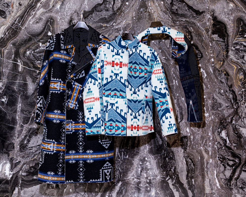 <CLASS>初となる別注アイテムは、<PENDLETON>のヴィンテージ生地をBEAMSから提案したことから始まり、その後デザインを堀切さんに一任して誕生したコレクション。 60年代のオートクチュールコートやリバーシブルジャケット、さらにはライダースをスリーブのみにしたボディレスジャケットの3型を採用し、特殊フラット縫製により縫い代をなくすことで流れるようなシルエットを演出。さらに<PENDLETON>のクロスロードブランケットにパンチングしたウルトラスエードをボンディングした生地を使用し、パンチングから覗く裏地と表地のコントラストが楽しめるユニークなアイテムに仕上がりました。