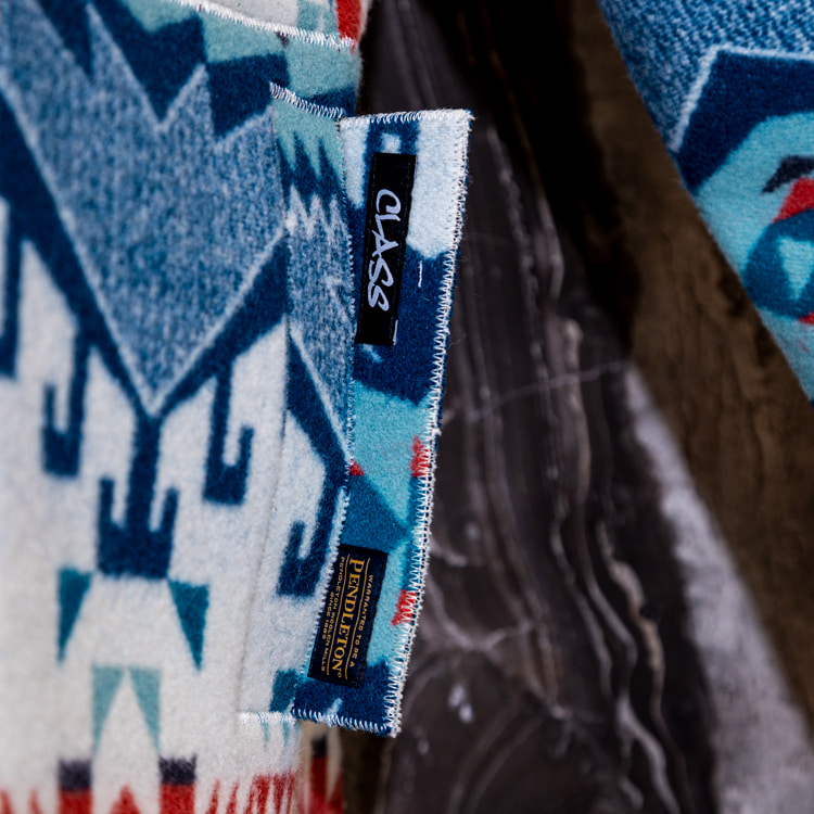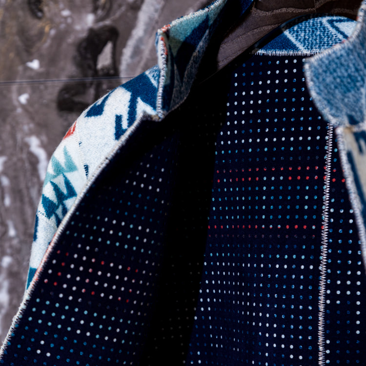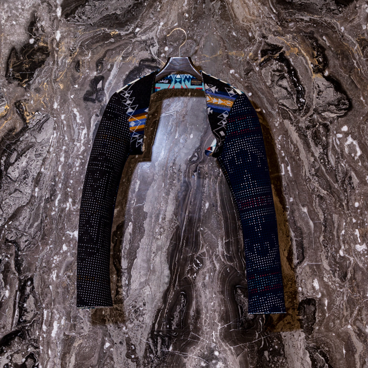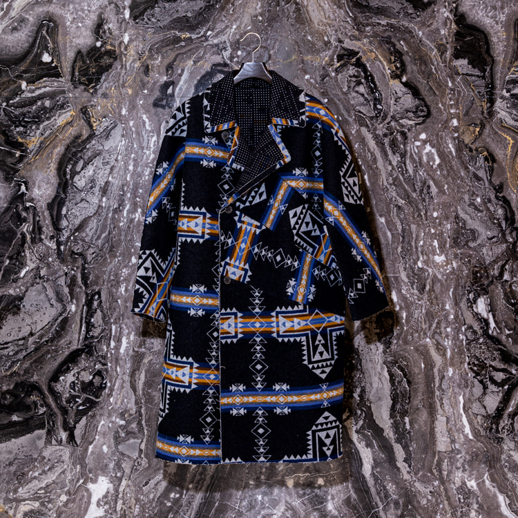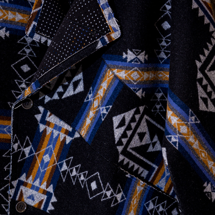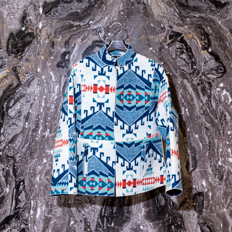 <CLASS>初となる別注アイテムは、<PENDLETON>のヴィンテージ生地をBEAMSから提案したことから始まり、その後デザインを堀切さんに一任して誕生したコレクション。 60年代のオートクチュールコートやリバーシブルジャケット、さらにはライダースをスリーブのみにしたボディレスジャケットの3型を採用し、特殊フラット縫製により縫い代をなくすことで流れるようなシルエットを演出。さらに<PENDLETON>のクロスロードブランケットにパンチングしたウルトラスエードをボンディングした生地を使用し、パンチングから覗く裏地と表地のコントラストが楽しめるユニークなアイテムに仕上がりました。