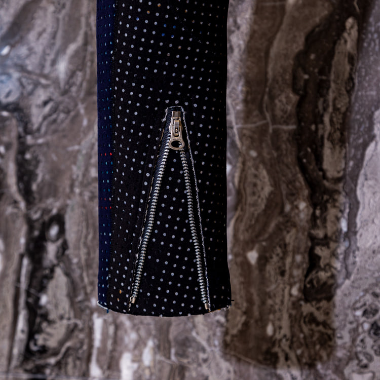 デザイナー後藤さんが所有していた、アメリカを代表するアーティスト ピーター マックスが手がけたパンツをイメージソースに、カラフルで70年代らしいサイケデリックな雰囲気を纏ったクレイジーパターンのフレアスラックスを別注。デットストックのスーツ生地を使用しモダンに仕上げています。