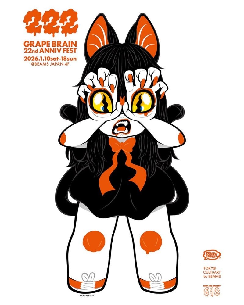 1月10日(土)より、「ビームス ジャパン」(新宿) 4階「TOKYO CULTUART by BEAMS」にて〈GRAPE BRAIN〉のポップアップショップ『222』を開催します。独自の世界観で“妖怪”をテーマにしたキャラクターを展開する〈GRAPE BRAIN〉。今回のポップアップショップでは、〈GRAPE BRAIN〉によるBEAMSスペシャルカラーソフビのリリースのほか、新作ソフビの展示販売、アパレルグッズの販売を予定しております。