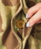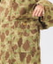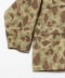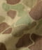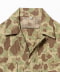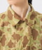 ■デザイン高密度で強度のあるヘリンボーンツイルにプリントされた迷彩柄は、グリーンサイド(表)とタンカラーサイド(裏)の両面に施されています。リバーシブル仕様ではありませんが、この両面プリントが生地に奥行きを与え、独特の表情を生み出します。当時、毒ガスの侵入を防ぐためのディテールであった「ガスフラップ」を前立て裏に、容量の大きい縦長のマチ付きポケットや、補強のための二重仕様の肘といった本格的なミリタリーディテールもポイントです。