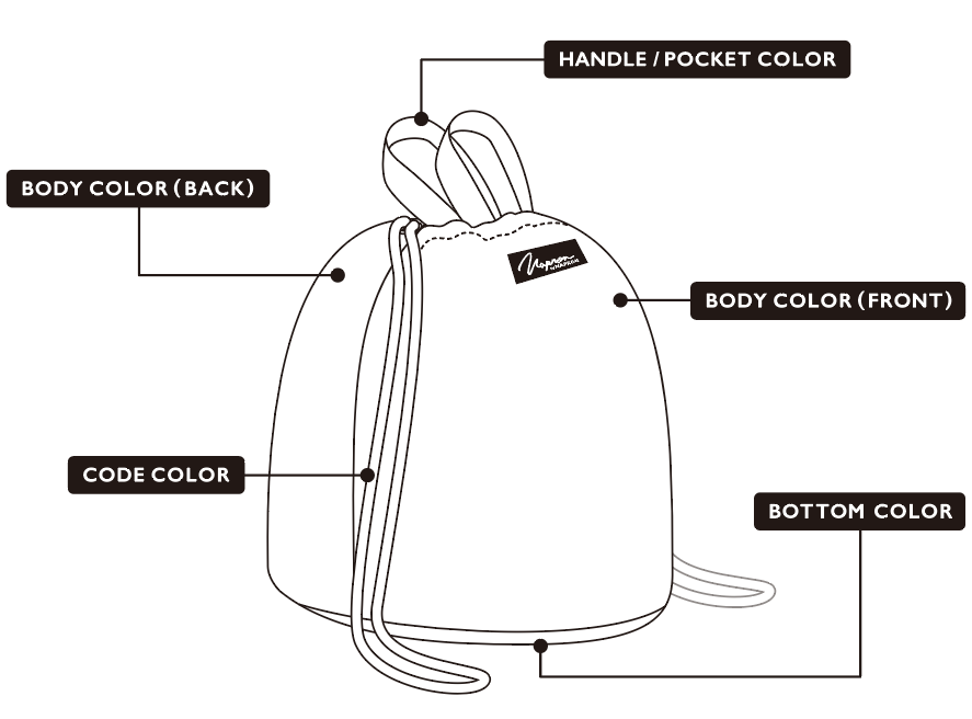 ①ボディ(フロント) / ②ボディ(バック) / ③底布 / ④ハンドル・内ポケット:49色