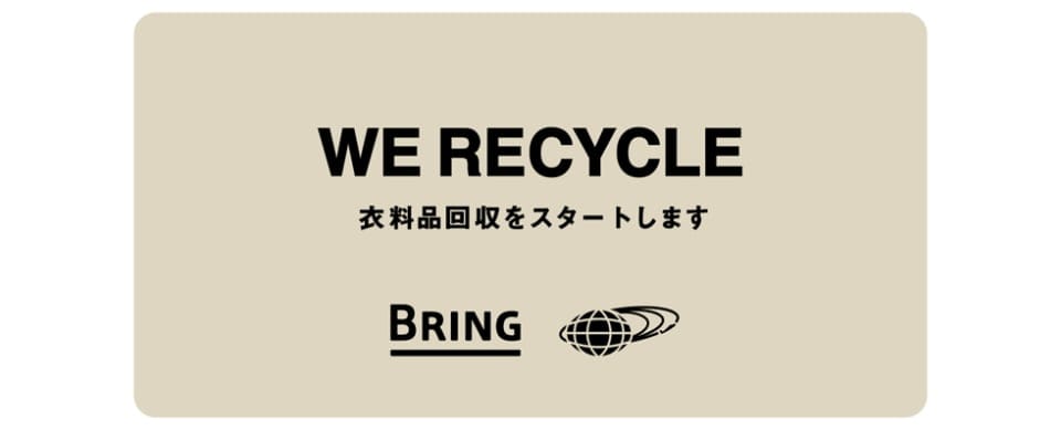 が運営するプロジェクト"BRING”と提携し、この秋よりお客様が不要になった衣料品の回収を実施します。実施対象店舗にお持ち込み頂いた衣料品は、BRINGによって回収、再資源化され新たな衣料品や繊維製品に生まれ変わります。このプロジェクトを通して"洋服を永く大切に使うこと”に対してのメッセージを発信します。