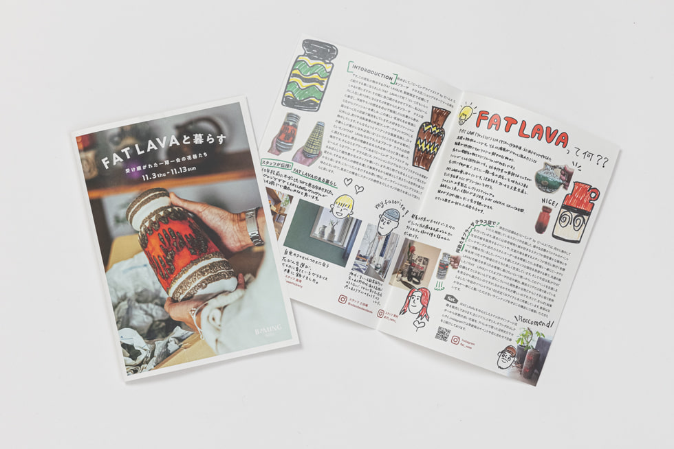 本イベント用に制作した「FAT LAVAと暮らす〜受け継がれた一期一会の花器たち〜」のリーフレットを店頭にて無料配布いたします。※数に限りがございますので、無くなり次第終了とさせていただきます。