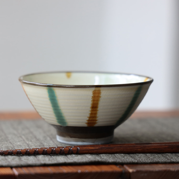 「白地に緑釉と飴釉、黒地に白釉と飴釉の線引きが目を引く美しいお茶 碗です。4.5寸サイズで深さもあるので納豆ご飯や卵かけご飯の時に 安心感があり使いやすいです。大盛やおかずをオンザライスなどわん ぱくにいきたい方にもおススメ。2色あるのでペアで使うのもいいで すね。贈り物にも是非」