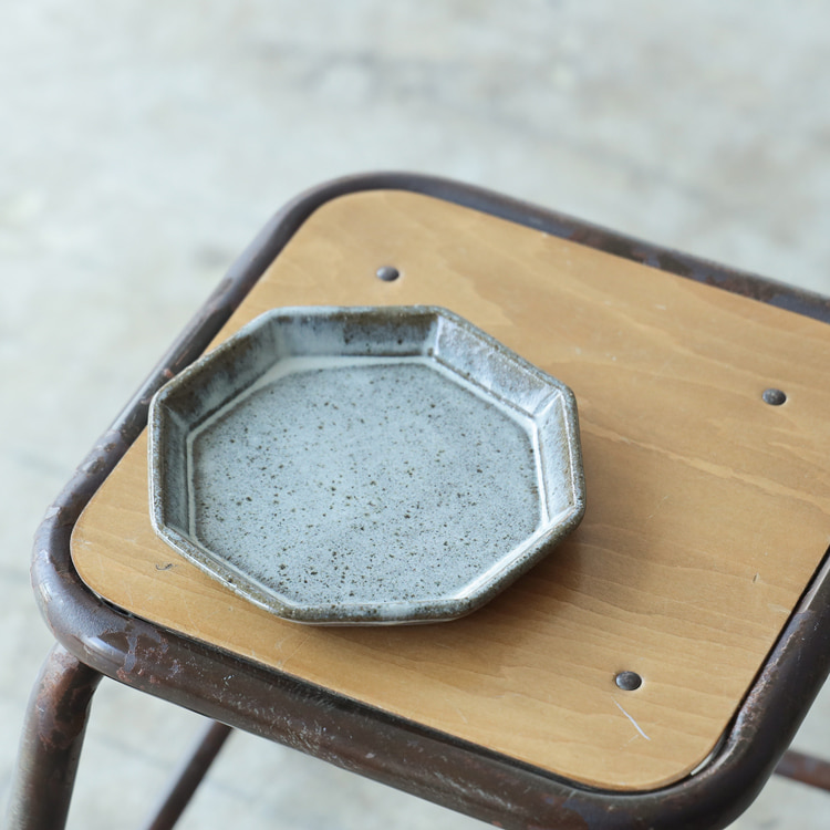 「幸福を招くと言われる縁起の良い八角のお皿。青みのある白い釉薬が素敵です!少し深さがあるのでカルパッチョなどソースを伴うお料理にも使えます♪あと、チーズケーキも似合いますよ〜」