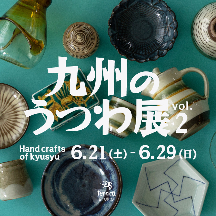 会期中は、九州のクラフトアイテムを〈fennica〉ならではの視点でセレクトしたアイテムをご用意。「小鹿田焼 坂本浩二窯」「小鹿田焼 黒木史人窯」「小代焼 中平窯」「小代焼 瑞穂窯」「かじや窯」「祐工窯 阿部眞士」「吹きガラス工房琥珀」「小石原焼 原彦窯」「小石原焼 金丸窯」「佐々木かおり」「艸茅窯」の作品を一堂にご覧いただけます。