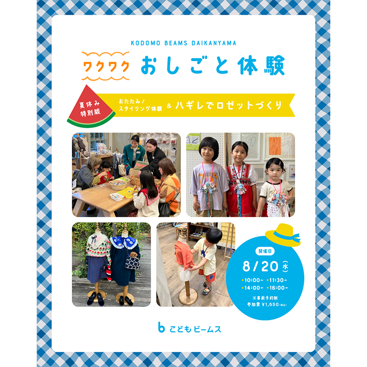 今回は、子どもたちの夏休みの時期に合わせて、参加人数を拡大した『わくわくおしごと体験 夏休み特別版』を実施いたします。(※当日は、「こども ビームス(代官山)」は通常営業しておりません)