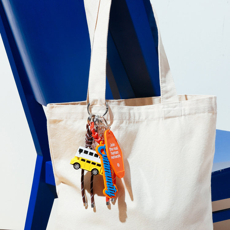 「AI時代の人間性」をテーマにしたオリジナルキーチェーン。