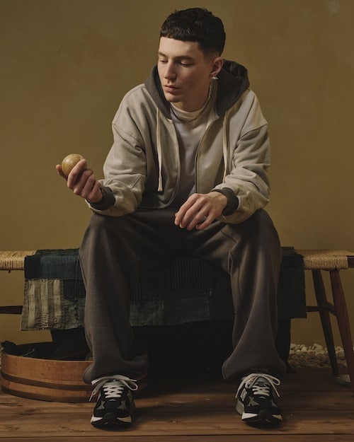 素材には、〈New Balance〉のスニーカーが持つ質実剛健なイメージに呼応する、アメリカ製ならではのタフさと風合いを備えたヘビーウェイトな生地と肉厚なコットン素材を採用。『クルーネックスウェット』、『ジップアップパーカー』、『Tシャツ』、『スウェットパンツ』の全4型を展開します。シルエットはインラインモデルよりもゆとりを持たせ、スポーツウェアの枠を超えた、現代的なファッションとして楽しめるバランスへと昇華しています。