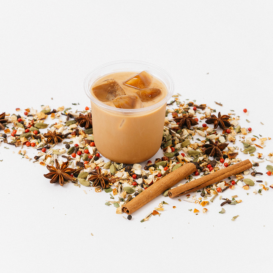 漢方の知見を詰め込んだクラフトハーブティーブランド〈TYNK(ティンク)〉のスパイスを贅沢に使用した、特別なチャイミルクティーができました。カルダモンやシナモンといった王道のスパイスに、高麗人参やヒュウガトウキ、クロモジなど、自然の恵みを凝縮。一口飲むたびに、スパイスの華やかな香りと和漢植物の深いコクが体中に染み渡ります。