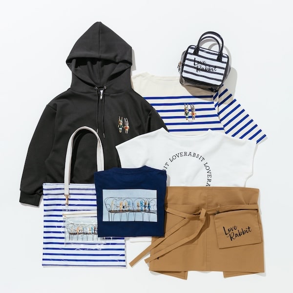 ラインナップは、就労支援施設で働く未知子さんたちが手がけたぬいぐるみ“LOVE RABBIT”の写真とインスピレーションワードを組み合わせたTシャツやフーディー、さらに“LOVE RABBIT”や未知子さんのイラストを総柄で表現したバッグなど、アートの温もりを感じるアイテムを揃えました。