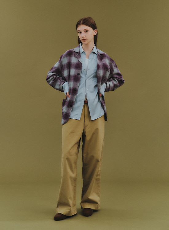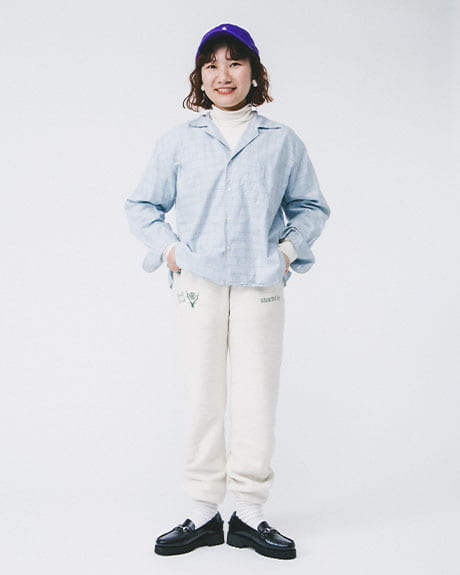 「シャツの印象が引き立つように、オートミールのパンツと白のインナー、靴下をチョイス。足元にはローファーを合わせてシティボーイ風に。春先はタートルネックを忍ばせたり、ロゴTの上に羽織ったり、1年を通して自由なコーディネートを楽しんでます」