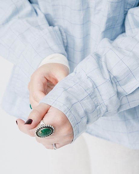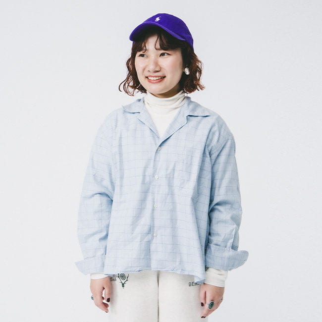 「思い入れの深いアイテムは、2年程前にオーダーしたこちらのシャツです。過去にはボタンダウンなどカチっとしたシャツをオーダーすることが多かったので、珍しくリラックス感のある柔らかい生地をセレクトしてみました。着慣れたパジャマのようなクタッとした表情と、程よいシワ感を出すために芯なしでオーダー。チェスト(胸囲)とウエストがくびれていない、メンズライクなシルエットが気に入ってます」