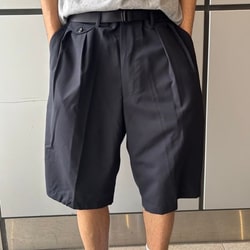 2プリーツショートパンツ。〈175cm Lサイズ着用〉リラックス感のあるシルエットでひざ下程度の丈感がとてもよいです。汎用性の高いパンツなので春夏活躍します。