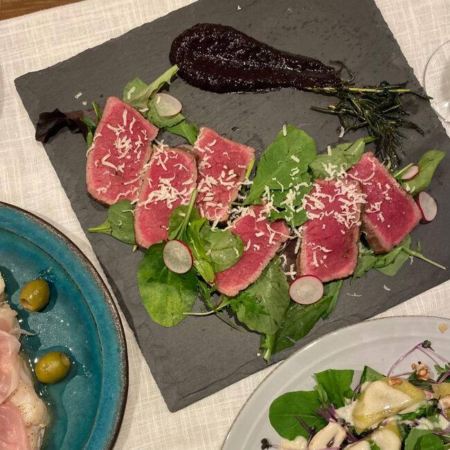 四品目は牛のタリアータ・ブルーベリーソース。