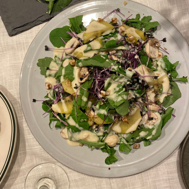 一品目はキウイとマッシュルームのサラダ・ヨーグルトドレッシング。