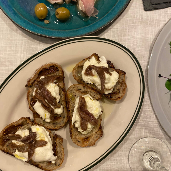 トーストしたお好みのパンにちぎったブッラータとアンチョビを乗せて、オリーブオイルをかけるだけ!