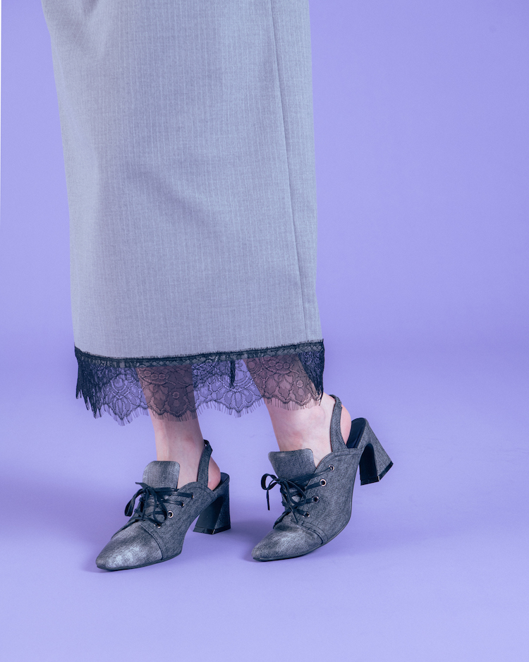 TACHI:ランジェリーデザインのキャミワンピースにこちらもトレンドのパワーショルダーのカットソー、足元はヒールを合わせたシックなスタイリングです。レースにメッシュと様々な要素があるので、華奢なシルバーアクセサリーを合わせました。