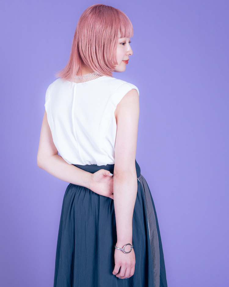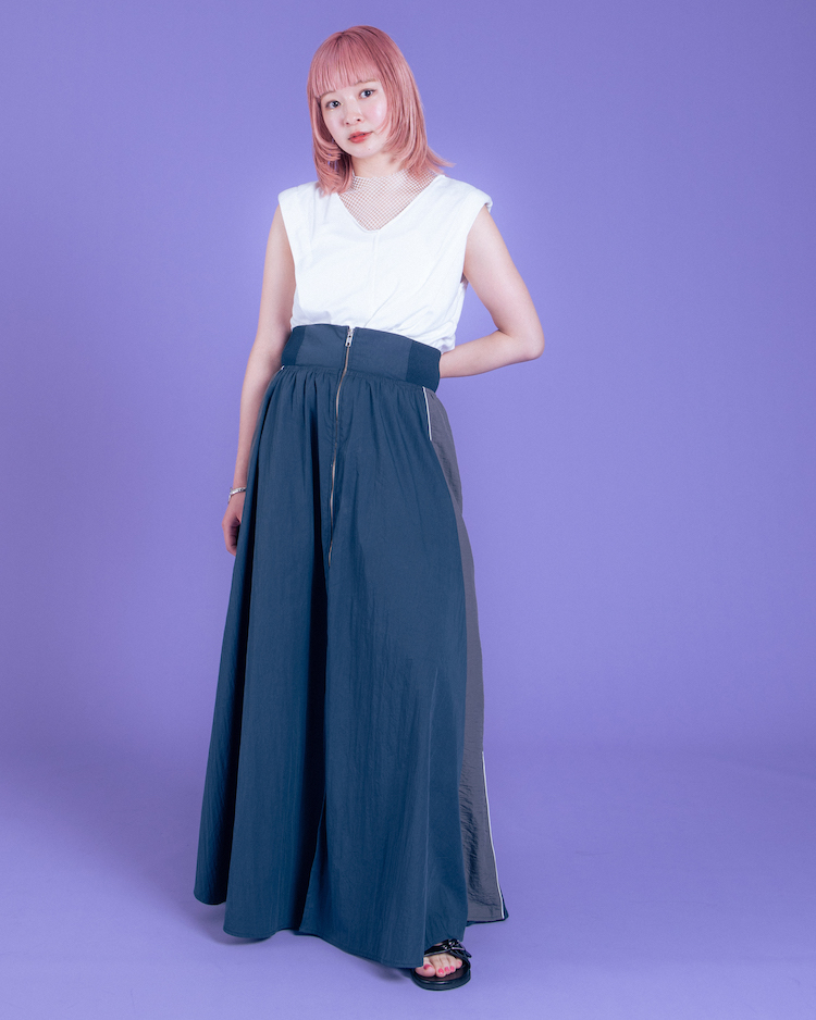 NAKANO:スポーティーなナイロントラックスカートにSTAFF TACHIが着用している色違いのカットソーを合わせました。シンプルなスタイリングながらパワーショルダーデザインがカジュアルさを抑え、モードな印象に昇華してくれます。