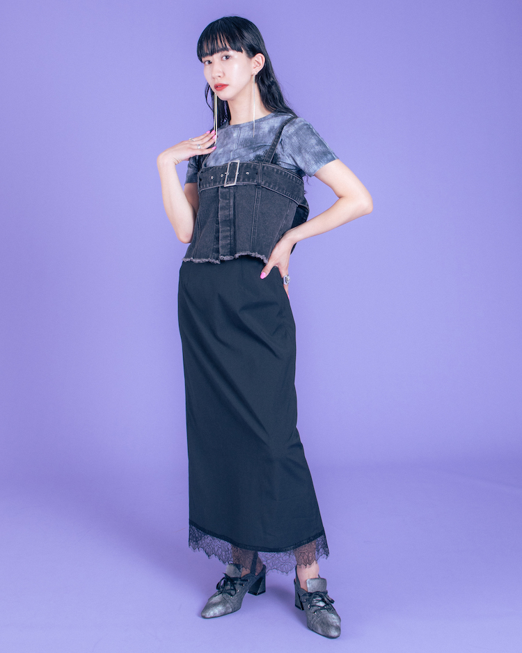 MATSUDO:STAFF MOCHIZUKIと同じデニムの転写プリントTシャツにデニムビスチェをレイヤードし、今回は女性らしいランジェリーデザインのキャミソールワンピースを合わせました。ボトムスが変わるだけでもガラッと印象が変わりますね!より女性らしい着こなしを楽しみたい方にオススメです!