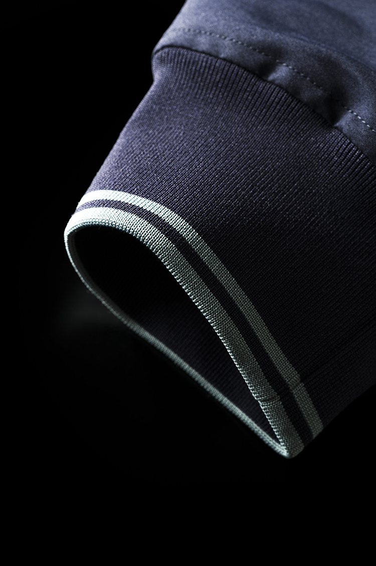 リブとロゴ刺繍以外の部材はネイビーで色数を抑えて。だからスマートに着こなせる。