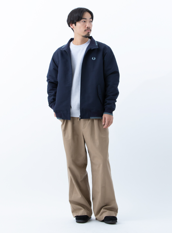 FRED PERRYの中でもクラシックなアイテムと知られる“ハリントンジャケット”ですが、そこにBEAMSらしいアレンジでトレンドのスポーツ要素をMIXさせた所がオススメのポイントです!レギュラーフィットのブルゾンに対してパンツはかなり大きめなアイテムを選んだ点です。上品な雰囲気はもちろん合いますが、海外ストリートシーンで着用しているようなラフな着こなしを意識しました。太めのスラックスで綺麗目、膝下丈のパンツやスウェットパンツでよりトレンドに合わせた着こなし。