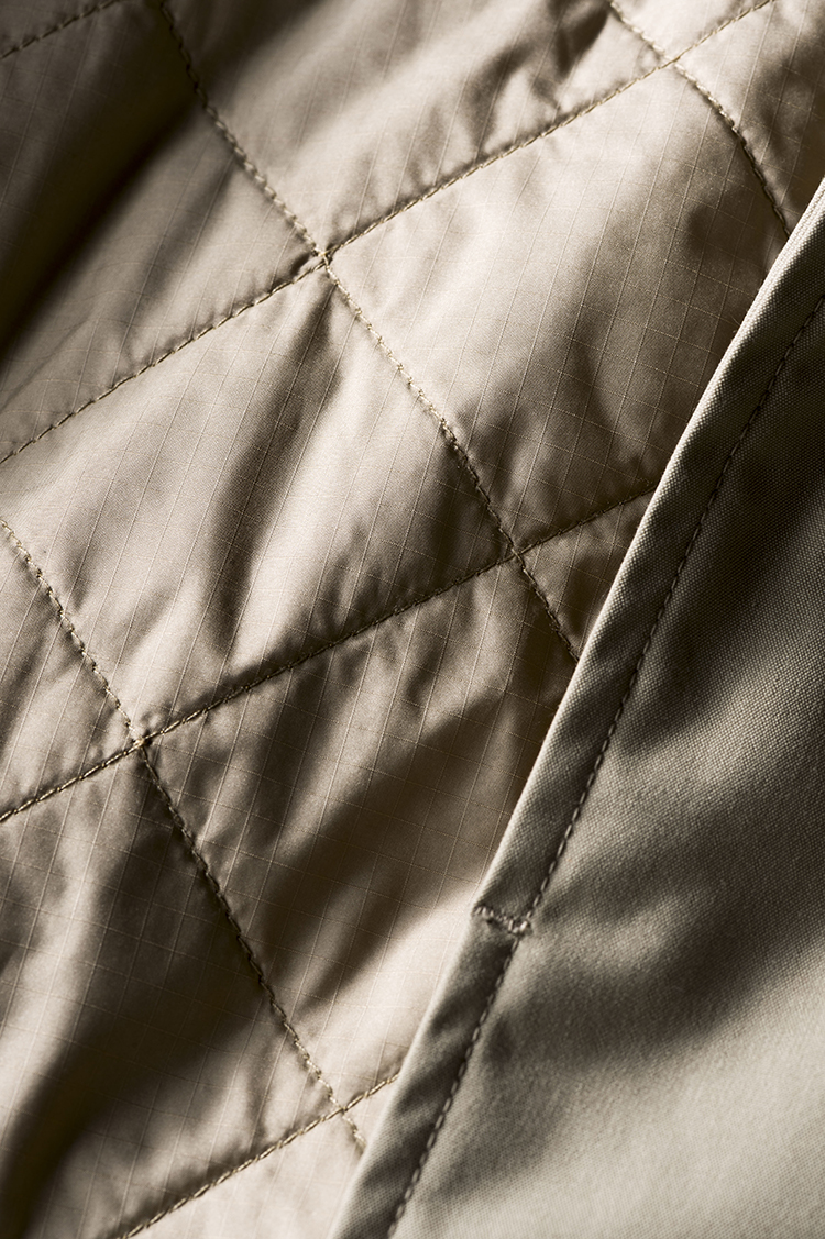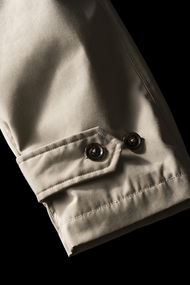 ややゆとりがある着丈や袖は、休日ではトレンド感を醸し、ウィークデイでは中にジャケットを着込んでも羽織りやすいバランスに。素材は〈ザ・ノース・フェイス〉がもう何十年も前に開発したベイヘッドクロスで、ポリエステル65%・コットン35%の古きよき機能素材。水を含むと膨張するコットンの性質を生かしつつ、通気性のよいポリエステルを混紡することで耐水性を付与しています。でも素材感はレトロで、いい意味でテッキーさは薄くマットな光沢がクラシックな雰囲気。ゆえに普段使いに最適というわけです。クラシックなおじさんコートのようであり、後述のような機能素材も備えると、非の打ちどころのない『中庸』ど真ん中の出来栄えです。