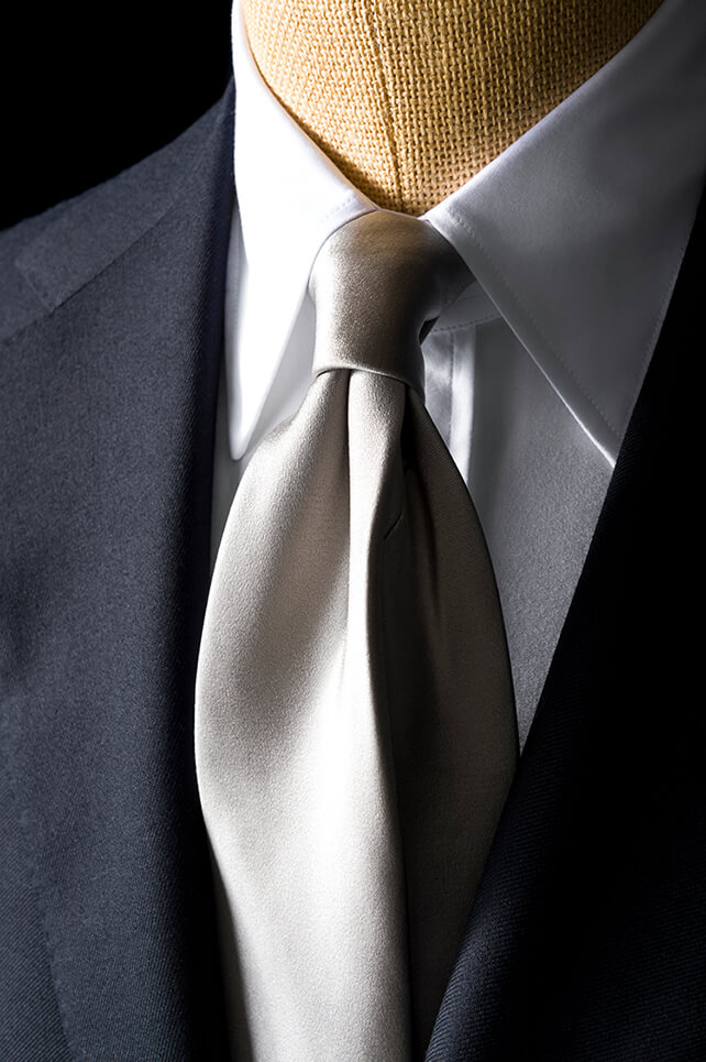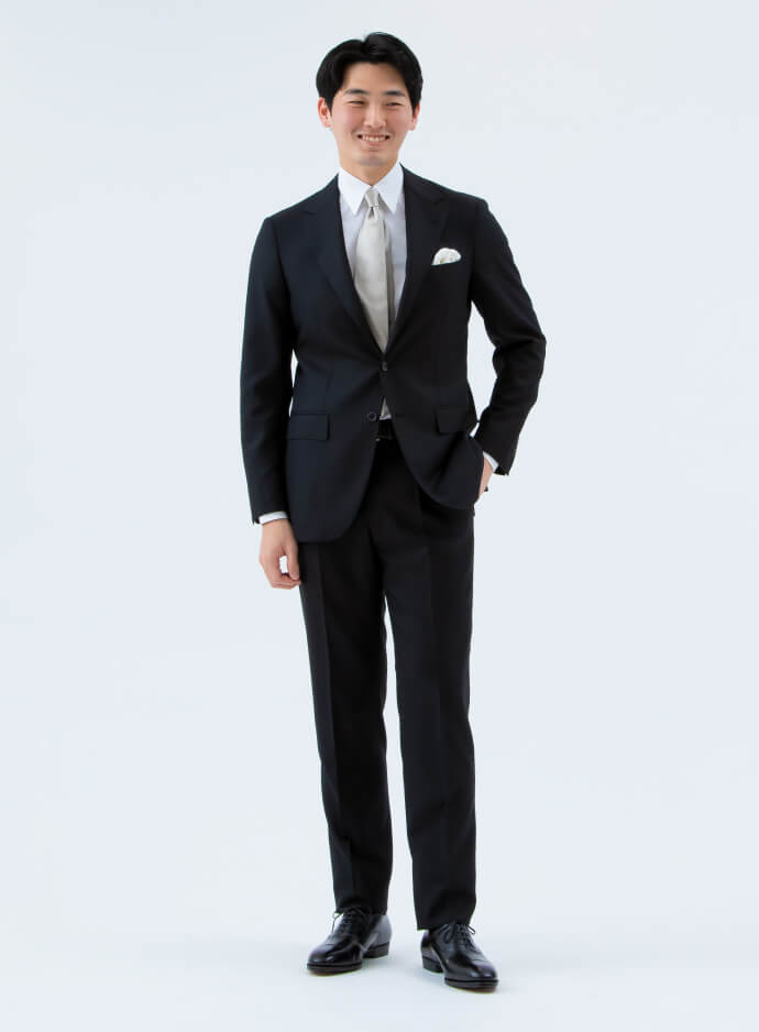 冠婚葬祭にふさわしい仕立てのいいスーツです。式典ではシンプルなコーデを心がけており、ネクタイやチーフはスーツの生地に合わせて艶のある上質なものを選んで、統一感を演出しています。