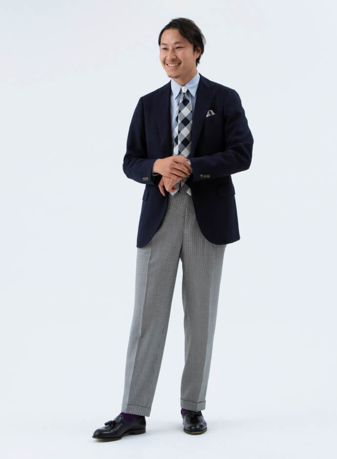 個人的に、タッセルローファーといえばアイビー! 今回は王道のブレザーにハウンドトゥースのトラウザーズ、大柄のチェックタイをあわせてみました。日本人用にヒールカップが調整されていて履き心地もいいですよ。