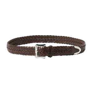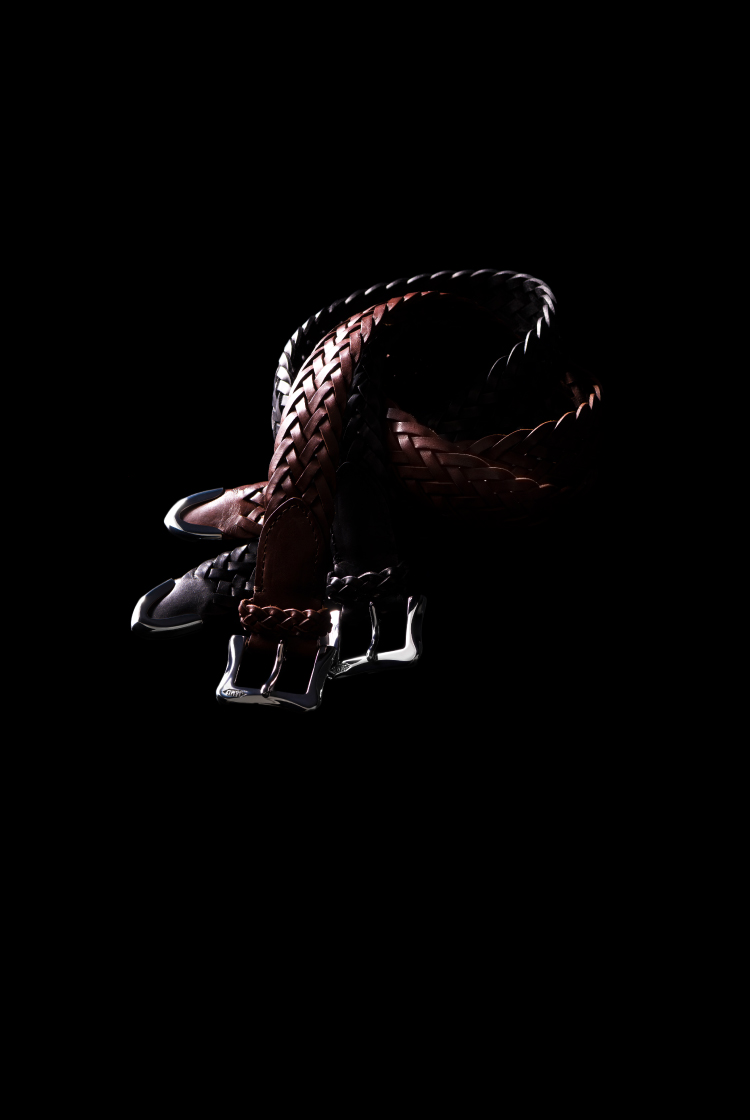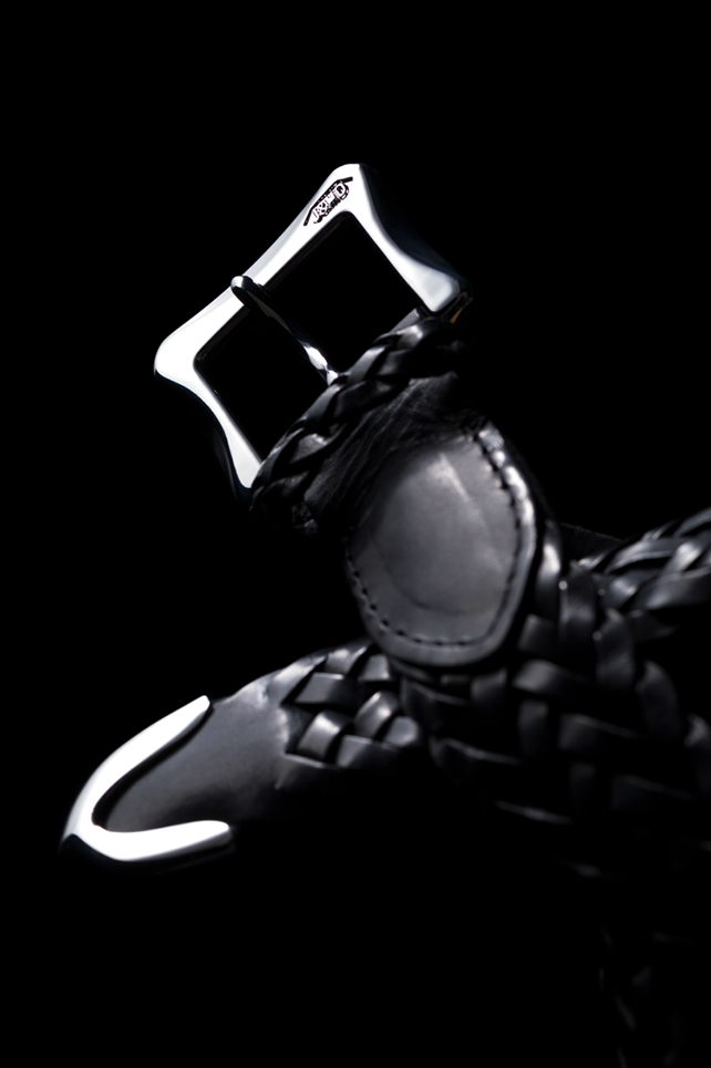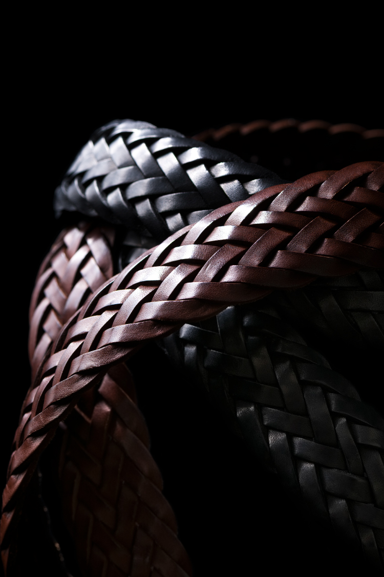 上質なカーフレザーを用い、職人が一本ずつ手編みしたメッシュベルト。抑制の効いたボリューム感と、立体的な編み込みが魅力。