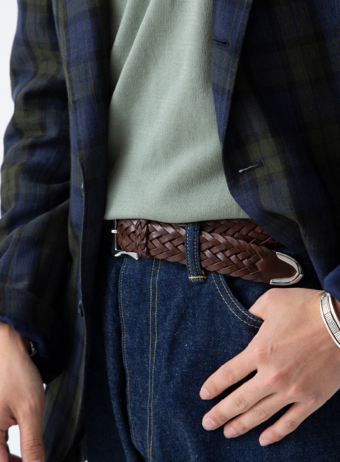 メッシュベルトはもともとカジュアル寄りのアイテムですが、〈ジェイアンドエムデヴィッドソン〉の一本は、レザーのボリューム感を巧みに抑え、ドレッシーな表情に仕上げているところが秀逸。30ミリ幅も細すぎず太すぎずの絶妙バランスで、休日のデニムスタイルはもちろん、キレイめなスラックスやカッチリめのスーツ姿にも自然にフィットしてくれます。この守備範囲の広さこそ、レザーベルト界の永遠のベーシックとして長年愛され続ける理由でしょう。