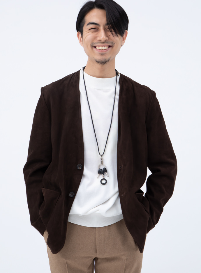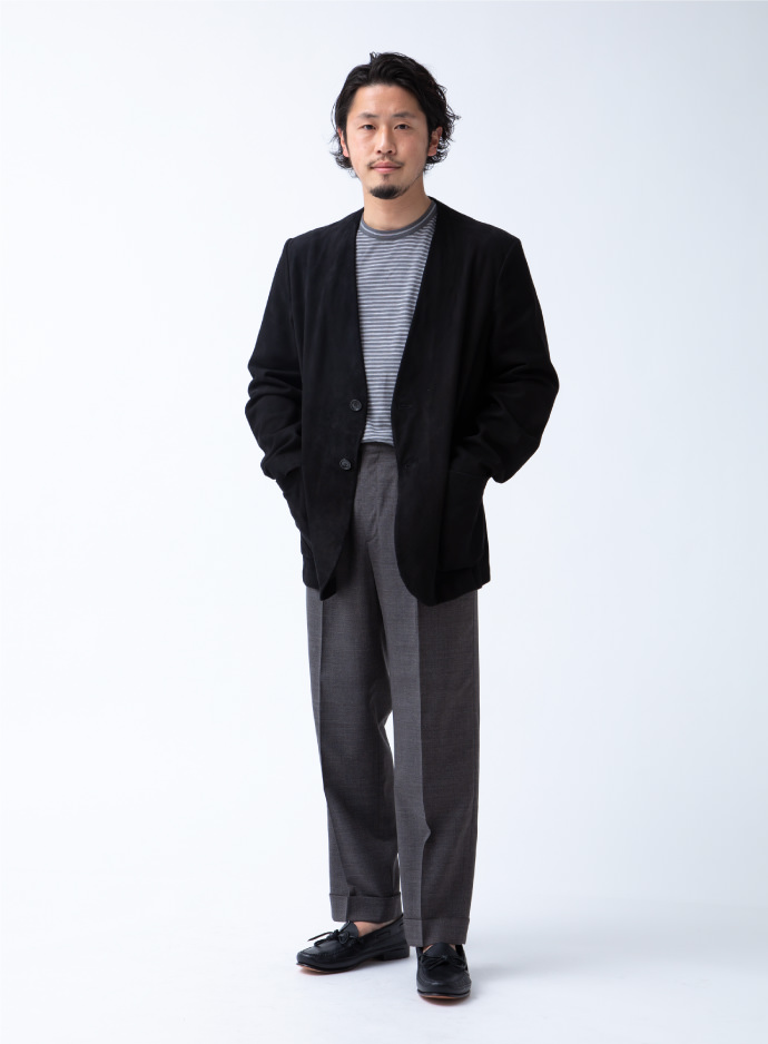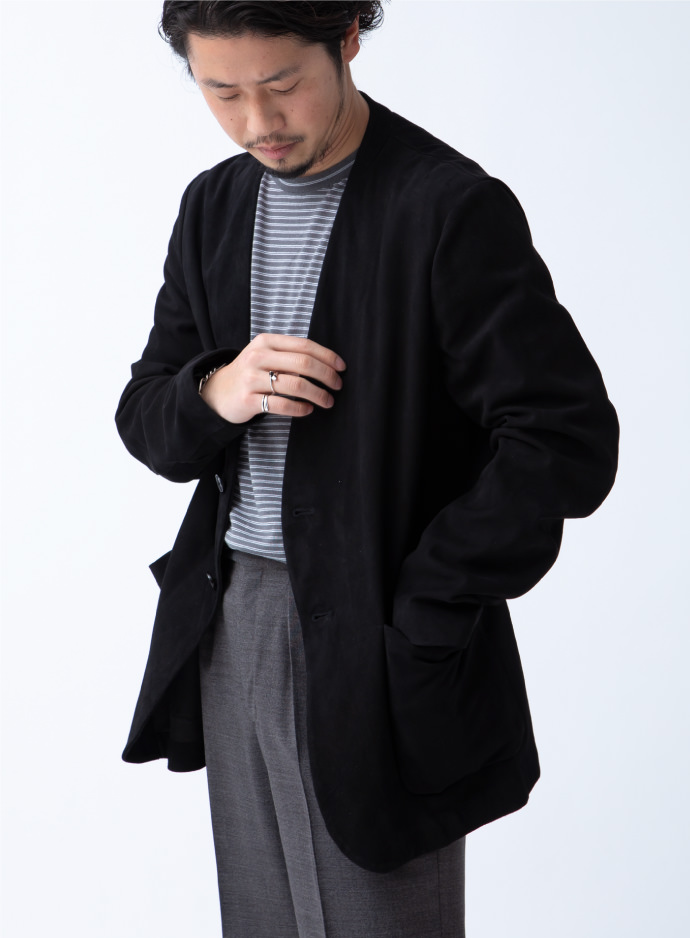ゴートスウェードの素材使いにより大人の風格を漂わせますが、ノーラぺルでラフに羽織れるのがいいですね。カジュアルなスタイルの格上げに活躍してくれます。言わずもがな、タイドアップルックに合わせても◎!